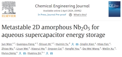 近日,武汉纺织大学化学与化工学院、省部共建纺织新材料与先进加工技术国家重点实验室徐卫林院士团队的万骏教授,与姜会钰教授、中国科学院深圳先进技术研究院金桓宇研究员合作,在Chemical Engineering Journal上发表了题为“Metastable 2D amorphous Nb2O5 for aqueous supercapacitor energy storage”的论文。武汉纺织大学为第一单位。研究生房光钰、米世云为共同第一作者。