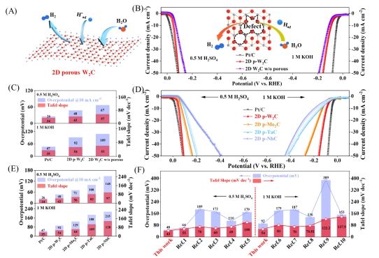 综上所述,微波热冲法作为一种新颖的合成策略,凭借其瞬时高温、快速冷却及多机制整合的独特优势,成功实现了二维多孔非层状过渡金属碳化物的高效制备。该方法在确保材料结构稳定性的同时,显著提升了电催化性能,尤其是在析氢反应中的表现。其广泛的适用性和出色的性能优化潜力,为其它能源材料的设计提供了新思路。
