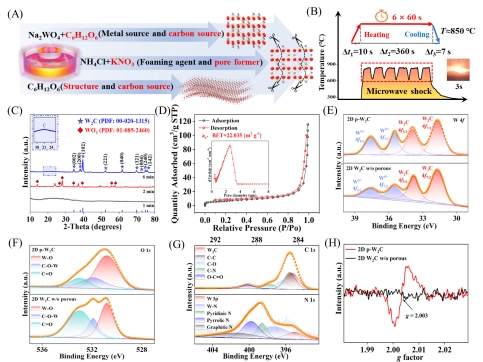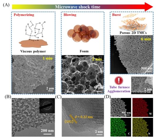 图2 微波热冲法制备多孔二维过渡金属碳化物的示意图与材料结构表征。