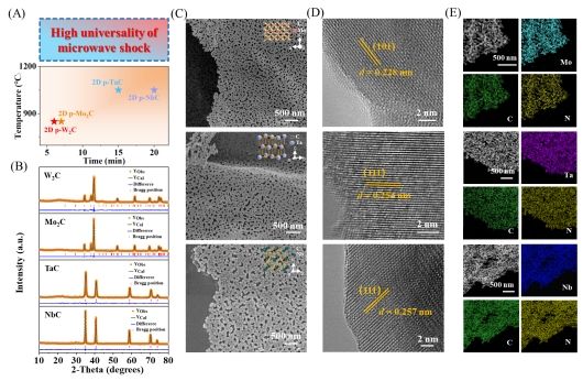 此外,微波热冲法还展现出对多种多孔二维过渡金属碳化物的广泛适用性(图4),如Mo2C、TaC和NbC,均能通过该策略成功构建二维多孔结构。该方法突破了传统合成路线的局限,为复杂结构材料的精准设计提供了可扩展性和灵活性。