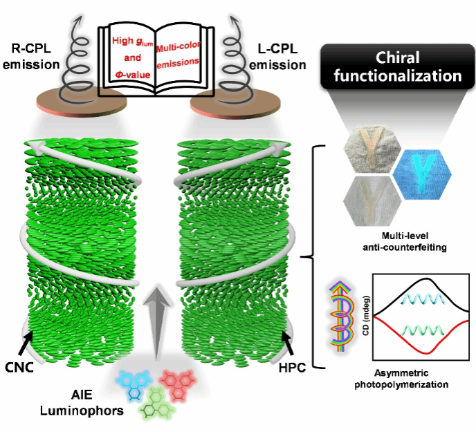 Our team proposed a strategy for co-assembling hydroxypropyl cellulose with aggregation-induced luminophores to construct L-CPL, achieving a large glum (+0.51) and high Φ (55.8%) in chiral fluorescent films. Additionally, these films exhibit comprehensive properties such as flexibility, solvent resistance, tunable structural colors, and multicolor L-CPL. They can serve as durable and multimodal optical anti-counterfeiting labels printed on fabrics, maintaining optical stability even after repeated washing and drying. Moreover, they can act as chiral light sources to induce asymmetric photopolymerization reactions with opposite L-CPL/R-CPL. This work will promote the application of nanocellulose chiral optical materials in circularly polarized 3D displays, chiral molecular sensing, and CPL imaging.
