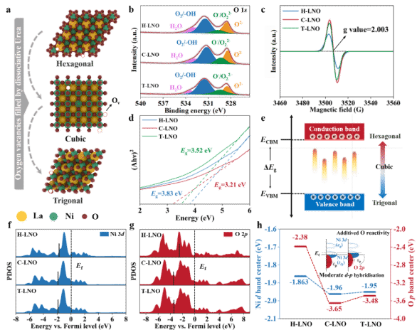 XPS analysis indicated the highest concentration of surface oxygen vacancies in the cubic phase, followed by the triangular and hexagonal phases. EPR spectra corroborated this trend. UV-Vis spectroscopy showed a significantly narrower bandgap for the cubic phase (3.21 eV) compared to the hexagonal (3.83 eV) and triangular (3.52 eV) phases, supporting enhanced conductivity. DFT calculations further elucidated how oxygen vacancies and the hybridization between Ni 3d and O 2p orbitals influenced catalytic performance.