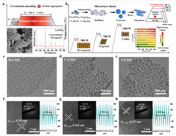 Compared to traditional high-temperature annealing methods that lead to particle aggregation, the microwave thermal shock method successfully synthesized 2D porous LaNiO3 structures in hexagonal, triangular, and cubic phases. SEM and HRTEM images confirmed the uniformity of these structures.