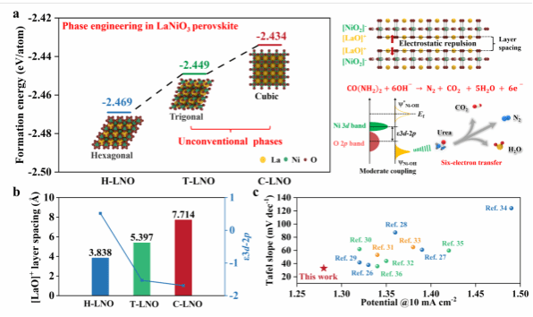 Phase engineering is a critical strategy in electrocatalysis for optimizing the electronic, geometric, and chemical properties of materials. However, achieving phase transitions in thermodynamically stable perovskite materials, especially within the constraints of 2D structures, remains challenging. LaNiO3 is a classic perovskite material whose electrocatalytic performance is closely tied to its crystalline phase. While the hexagonal phase of LaNiO3 demonstrates moderate catalytic activity, its conductivity and interlayer distance limit the diffusion and reaction efficiency of urea molecules. Introducing unconventional phases, such as the cubic phase, can enhance electron transport and accessibility of active sites, thus improving catalytic performance. Traditional high-temperature synthesis methods, however, struggle to precisely control phase transitions in 2D structures, adding complexity to phase engineering. The development of a rapid high-temperature reaction strategy is therefore critical for designing 2D LaNiO3 and high-performance UOR catalysts.
