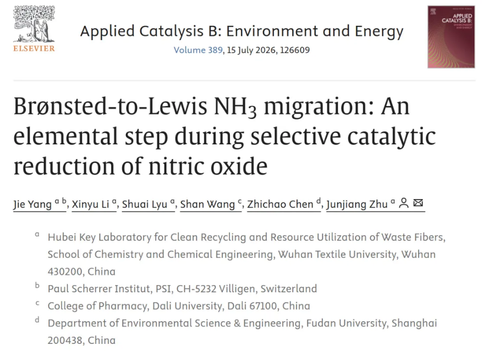 近日,武汉纺织大学化学与化工学院朱君江教授团队在NH3选择性催化还原(NH3-SCR)反应机理研究方面取得新进展,该研究系统揭示了Ce基SCR催化剂上NH3在Brønsted酸与Lewis酸之间的动态迁移机制,相关成果以“Brønsted-to-Lewis NH3 migration: An elemental step during selective catalytic reduction of nitric oxide”为题发表于Applied Catalysis B: Environment and Energy(IF 21.1)。武汉纺织大学为论文第一署名单位,团队青年教师阳杰博士为论文第一作者,朱君江教授为论文唯一通讯作者。