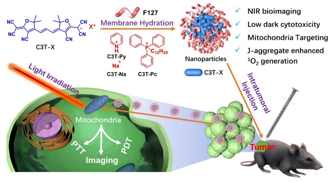 与阳离子类似物相比,阴离子花菁类分子的负电荷沿着整个聚甲炔主链离域分布,因此其不仅可表现出吸收红移增强光稳定性,而且有望缓解血液循环过程中的负捕获效应(negative trapping effect)。然而遗憾的是,由于缺乏合理的设计策略,基于阴离子花菁类的光敏剂至今尚未报道。因此,在本项工作中,通过巧妙的反离子工程,阴离子花菁分子首次被开发为高效光热疗法试剂。通过引入可被用为线粒体靶向剂的十二烷基(三苯基)膦阳离子(Pc),并将其作为阴离子TCF基三甲胺染料的反离子,成功合成了C3T-Pc。同时,具有膦盐反离子的C3T-Pc可以在水溶液中组装成超分子J型聚集体,并展现出显著的红移发射和增强的单线态氧产生效率(ΦΔ)。体内实验还显示,这些纳米颗粒具有负电荷表面、稳定的近红外细胞成像、线粒体靶向性和优异的光热治疗及光动力治疗效应,非常适合用于肿瘤光疗。