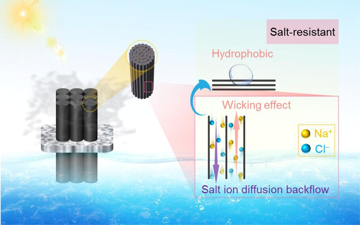 针对太阳能驱动界面蒸发材料不耐盐、蒸发速率低和成本高等应用关键瓶颈问题,本科生团队立足所学专业资源循环科学基本原理,结合学校纺织特色,引入聚酯纤维集束体,通过染料染色的方法制备三维蒸发器。聚酯材料表面疏水盐分不易沉积于材料表面,纤维集束体具有垂直的导水通道,可利用芯吸效应保障充足的水供应。所设计的三维太阳能蒸发器具有耐受高浓度盐水的优异性能,通过提高材料的暴露高度可从环境获得额外能量,实现高效率的盐水蒸发。工业化的聚酯纤维集束、商业化的染色技术,可以实现材料大规模低成本生产,为太阳能海水淡化技术走向应用和缓解淡水危机提供一条新的思路。