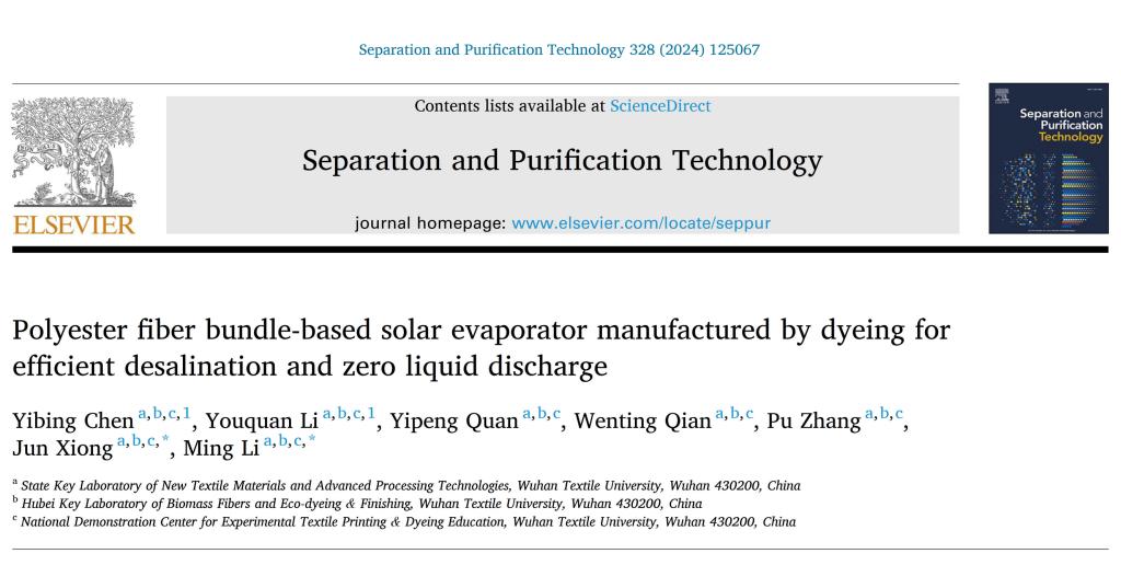 近日,化学与化工学院本科生陈燚柄、李有权等以“Polyester fiber bundle-based solar evaporator manufactured by dyeing for efficient desalination and zero liquid discharge”为题在分离纯化领域重要学术期刊《Separation and Purification Technology》发表最新成果。该论文共同第一作者陈燚柄、李有权为资源循环科学与工程专业本科生,团队包含5名本科生,指导老师为李明教授和熊俊博士,武汉纺织大学为唯一单位。《Separation and Purification Technology》(ISSN:1383-5866)译名《分离提纯技术》,是中科院工程技术1区Top期刊,2023年影响因子8.60。论文链接:https://doi.org/10.1016/j.seppur.2023.125067