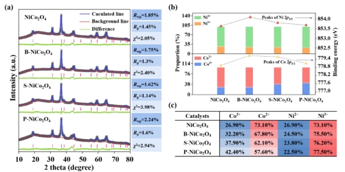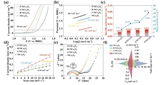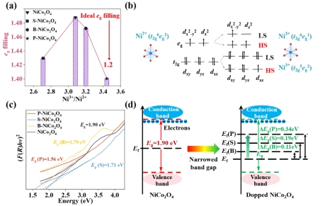 如图3所示,通过XRD测定了合成的NiCo2O4和掺杂构型的晶体结构,结果显示掺杂未引起晶体结构的明显变化。通过XPS检测了表面化学状态,显示磷、硼和硫等元素成功掺杂,而且这些杂原子的比例相似,证实了精确掺杂的可行性。随后,通过研究NiCo2O4中Ni3+含量的变化,发现磷掺杂(P-NiCo2O4)显著提高了Ni3+含量,这归因于磷的引入引起的电子结构变化,缩小了能隙并加速了电子转移。