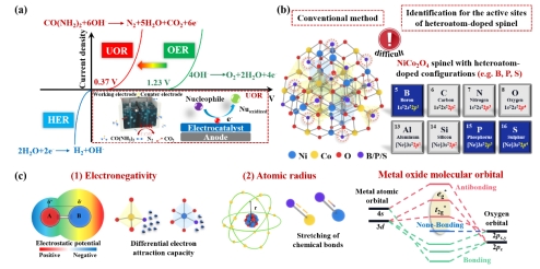 图1 (a)尿素氧化的优势。(b)杂原子掺杂尖晶石活性位点的鉴定。(c)影响电子构型的因素。