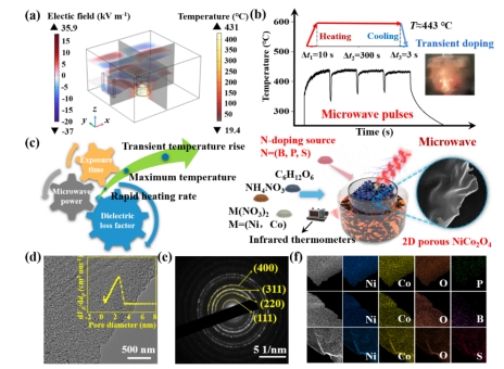 图2 (a)微波场模拟。(b-c)微波热冲反应设计与实时反应温度。(d-f)不同掺杂构型的二维多孔NiCo2O4形貌表征。
